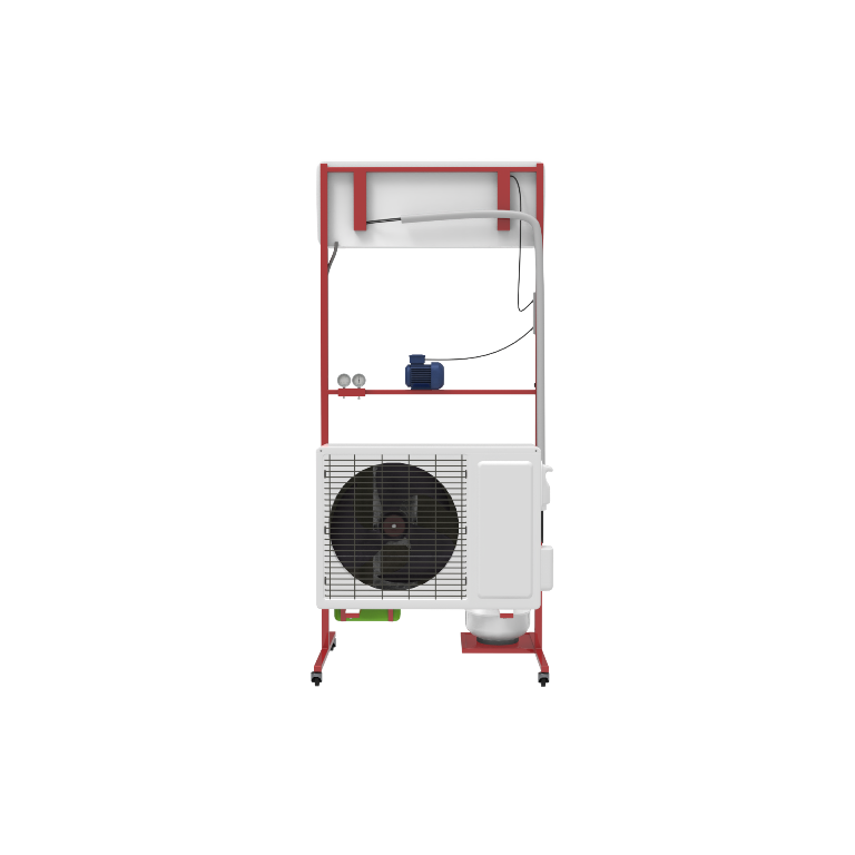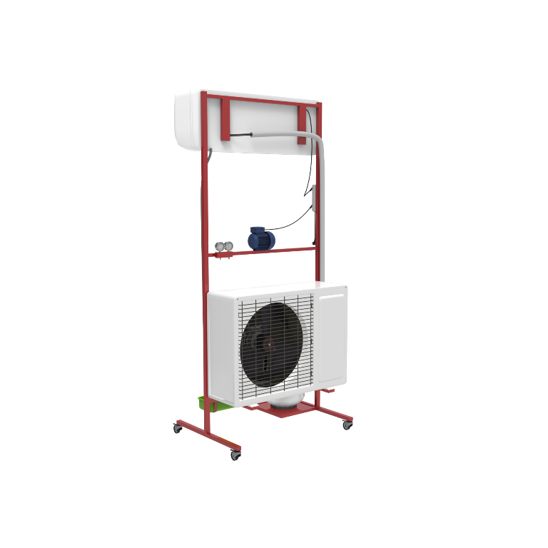Конструктивно стенд представляет собой напольную металлическую раму с колесными опорами, на которой смонтированы внутренний и наружный блоки сплит-системы кондиционирования, вакуумный насос, манометрический коллектор, система медных труб.