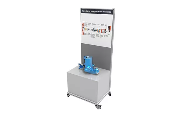 Представляет собой планшет, с закрепленным на нем насосом в разрезе и текстовой информацией о конструктивных элементах. Планшет может быть размещен на столе или стене, с использованием специальных креплений, входящих в комплект поставки. В комплект входит методическое пособие с подробным описанием устройства, принципа работы и сфер применения представленного насосного агрегата.