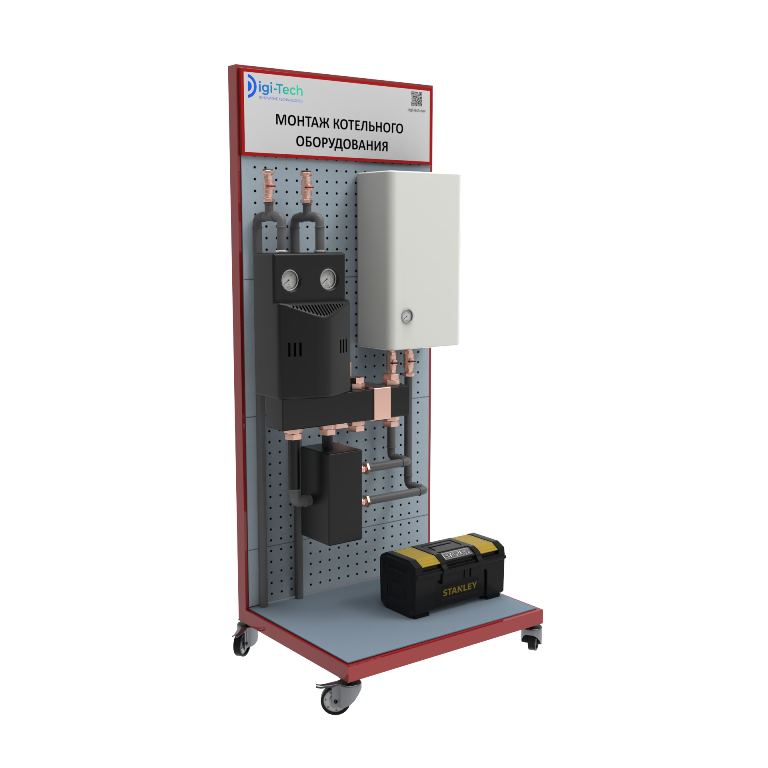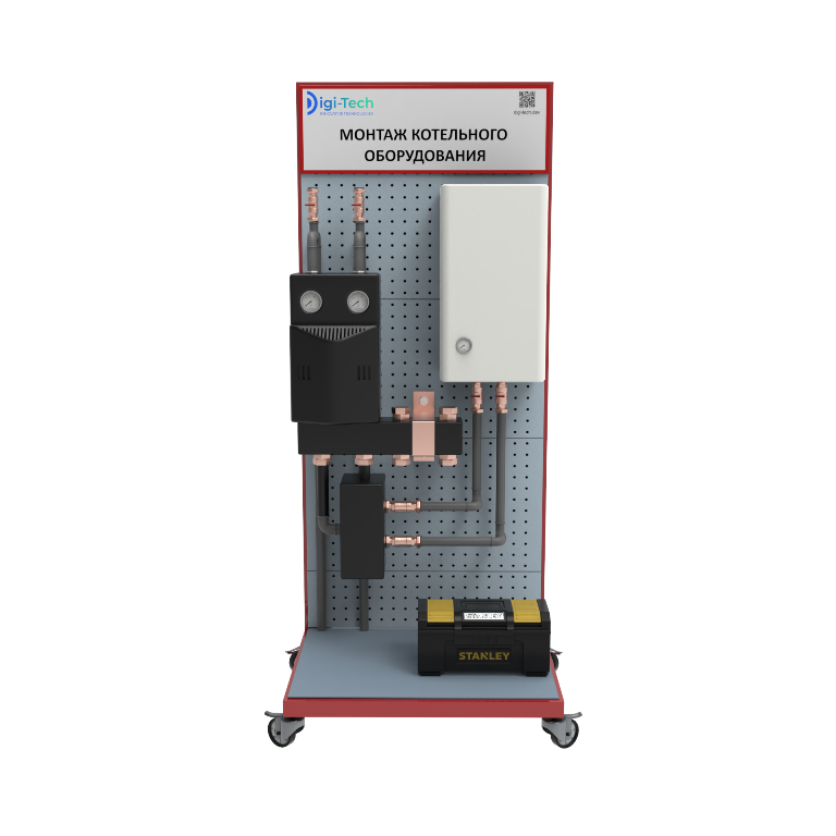 Стенд представляет собой мобильную рамную конструкцию, на которой для наглядной демонстрации смонтированы элементы котельного оборудования, подключенного к система ГВС и отопления. Стенд не требует подключения к системам водоснабжения и электричества.