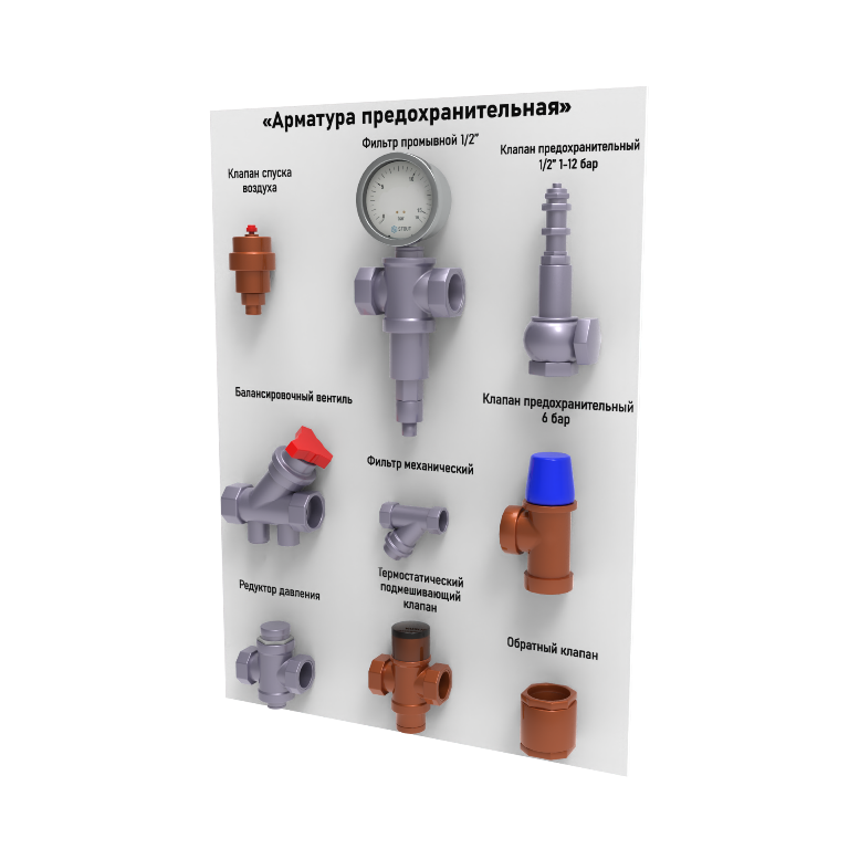 Представляет собой планшет, с закрепленными на нем натуральными образцами предохранительной арматуры, применяемой в системах водоснабжения.