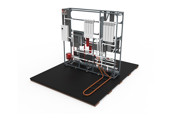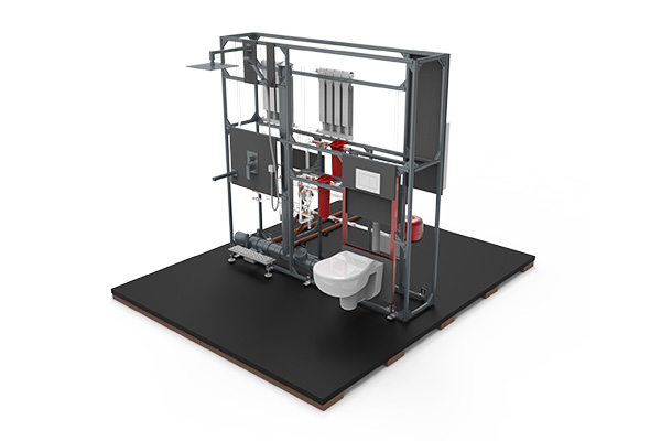 Стенд позволяет на практике изучить технологии и методы в области сантехники и систем отопления. Он включает в себя несущую рамную конструкцию, на которой смонтированы элементы систем водоснабжения, отопления и канализации жилого дома.