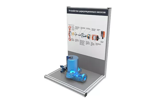 Представляет собой планшет, с закрепленным на нем насосом в разрезе и текстовой информацией о конструктивных элементах. Планшет может быть размещен на столе или стене, с использованием специальных креплений, входящих в комплект поставки. В комплект входит методическое пособие с подробным описанием устройства, принципа работы и сфер применения представленного насосного агрегата.