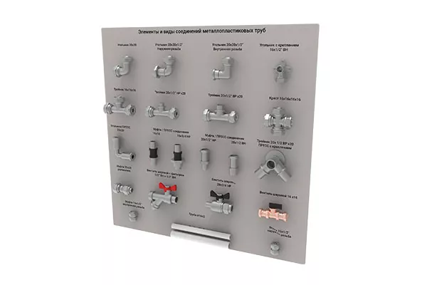 Представляет собой комплект планшетов, с закрепленными на них натуральными образцами элементов труб из различных материалов и соединительных фитингов. В комплект входит методическое пособие с подробным описанием устройства, принципа работы и сфер применения представленных элементов.